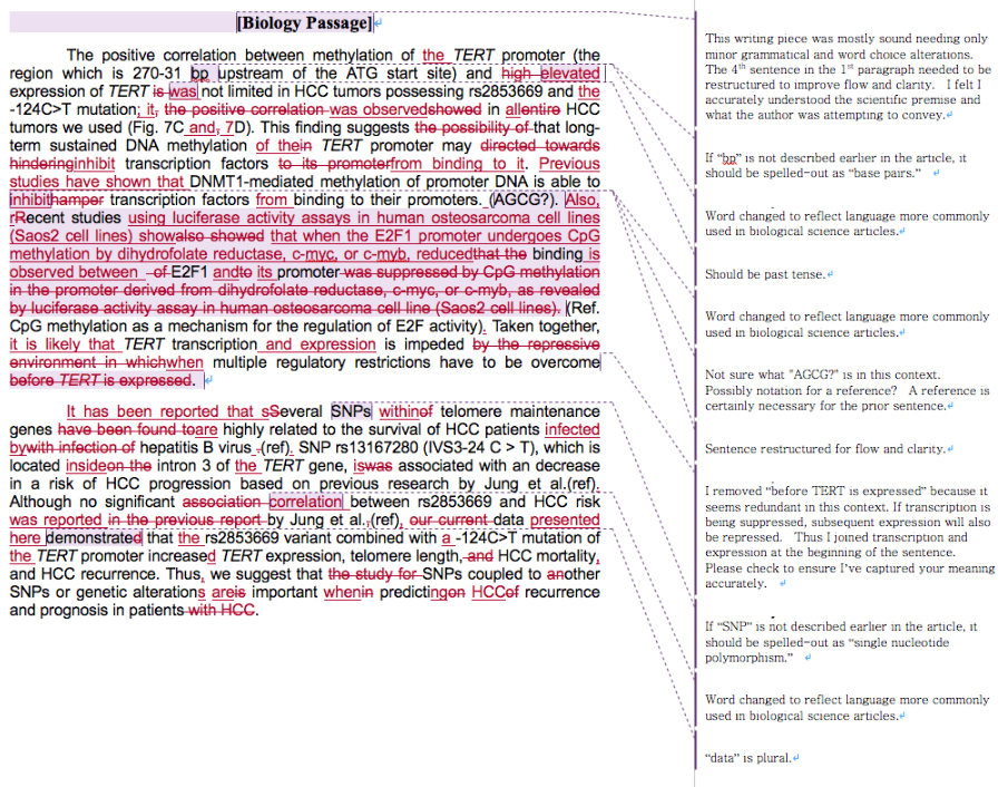 從 Editage(意得輯)與 Wordvice 提供的論文編修範本中可以看到,兩間專業的編修公司都會留下修改痕跡給客戶一一確認。