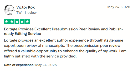 Editage 也提供清楚的中文介面,方便台灣使用者使用。Trustpilot 網站上留言的使用者對 Editage 評價到投稿前同儕審查服務有效提升論文的文章品質,能夠全方位照顧客戶的需求,對於不熟悉期刊要求的作者而言特別有幫助。
