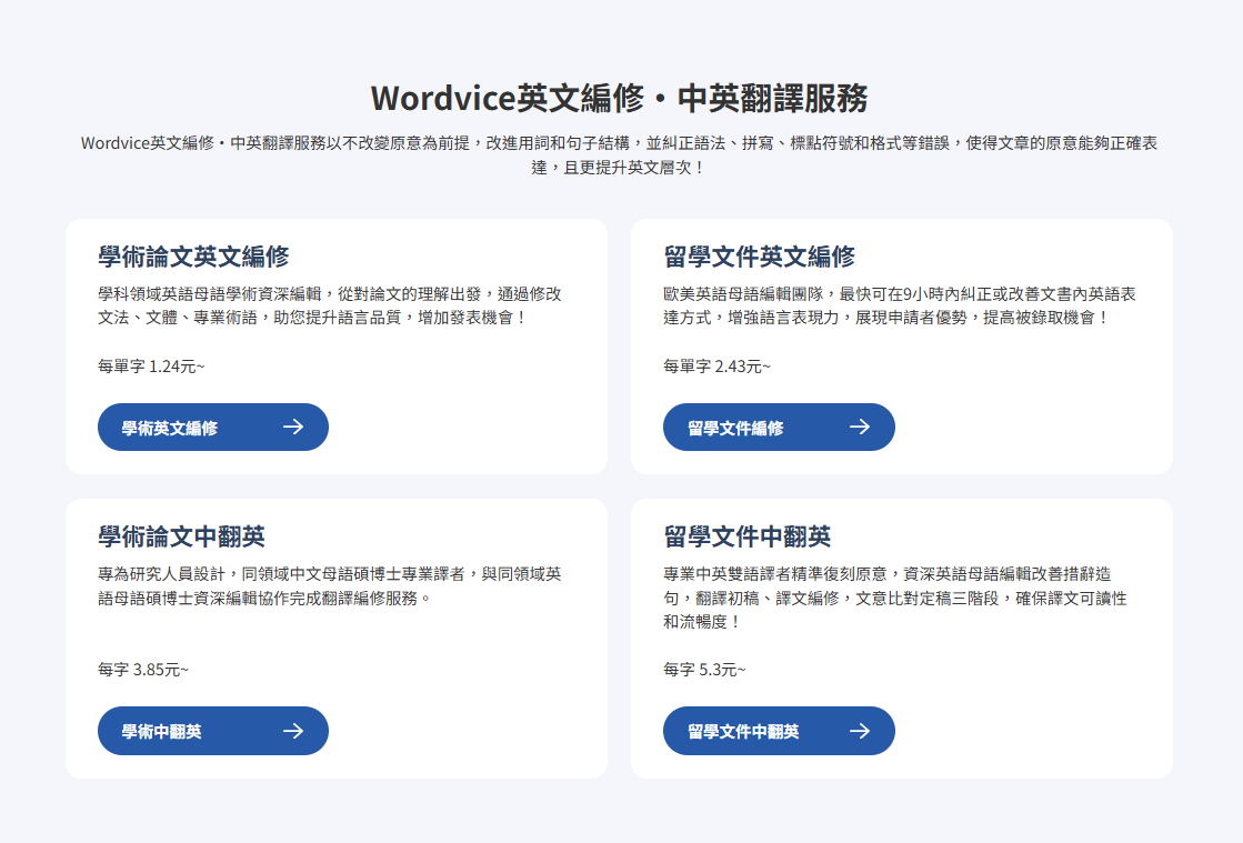 | 服務特色 | 高影響科學編修與一站式投稿服務 | 英文母語編輯全面支援學術、留學、商業領域;可搭配 Wordvice AI 寫作助手 |