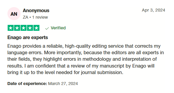 許多使用者稱讚 Enago 適合提交論文前最後潤稿。歡迎到 Trustpilot 網站上查看使用者對 Enago 英文編修服務的最真實評價。