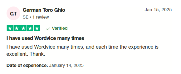 Wordvice 在全球知名評價平台 Trustpilot 上獲得高度評價。許多使用者回饋指出,憑藉 Wordvice 的專業度與可靠性,無論是學術論文或留學申請文件,都能獲得令人滿意的成果。