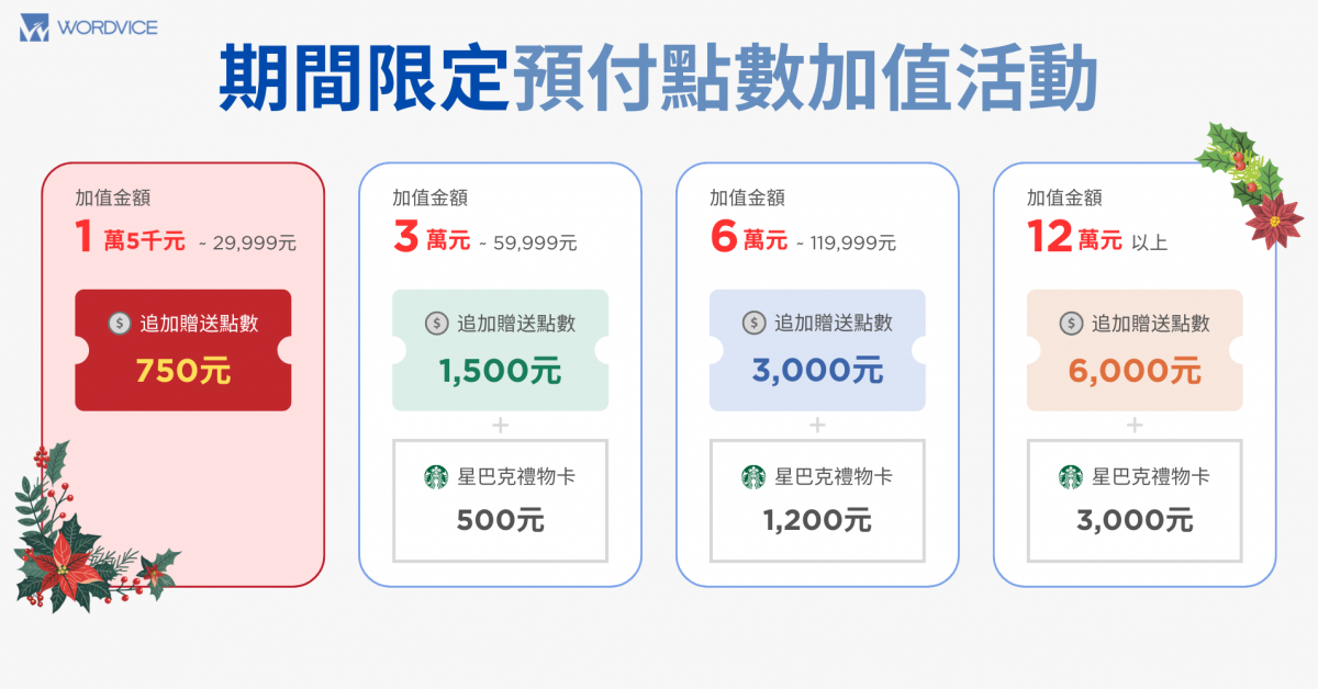 🎄 Wordvice 年末限定,全新預付點數加值活動開跑!