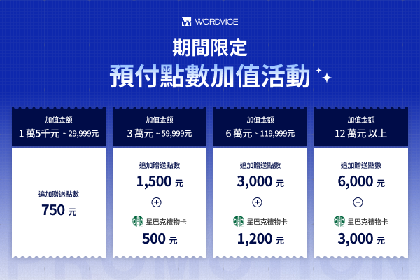 📚 Wordvice 期間限定,全新預付點數加值活動開跑!
